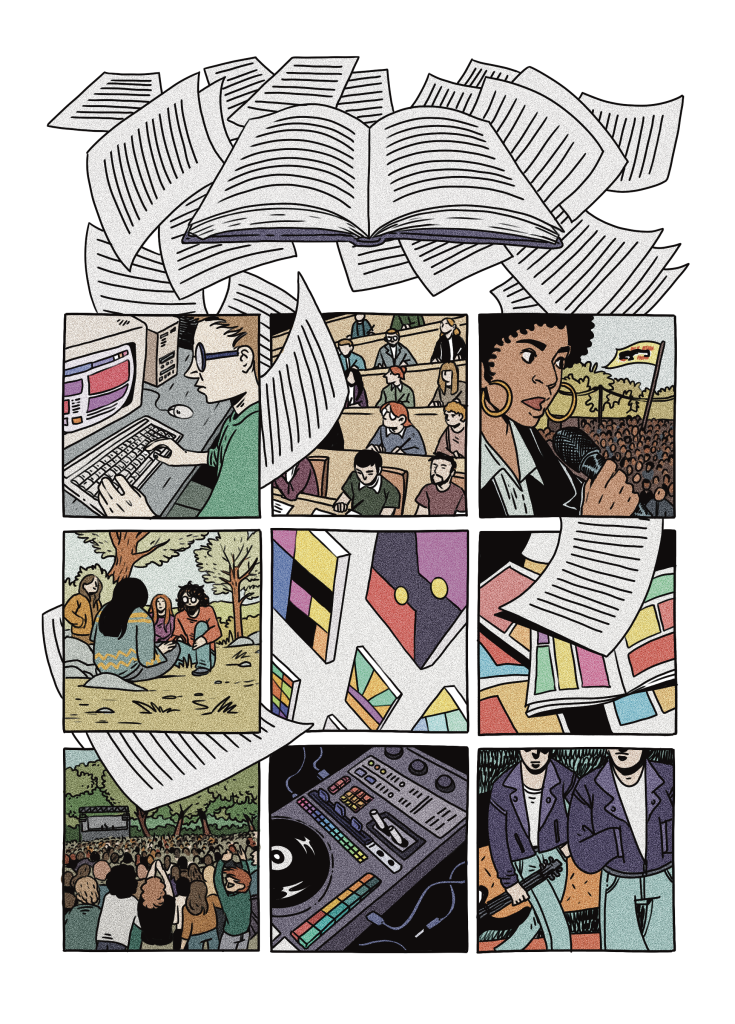 In the 1990s a new type of counterculture emerging from the initial internet revolution and the rise of electronic music and politicized science-fiction found food for thought, and great quotes to spread virally, within that same loose French corpus. The Matrix saga by the Wachowski sisters (who were then brothers), experimental DJs such as Spooky or Shadow, anarchist geeks and left-wing libertarians inspired by the promises of the Web 1.0—as well as architects, painters, or novelists—all testify to a scattered pop-cultural influence on the part of these intimidating French philosophers at the turn of the millennium.