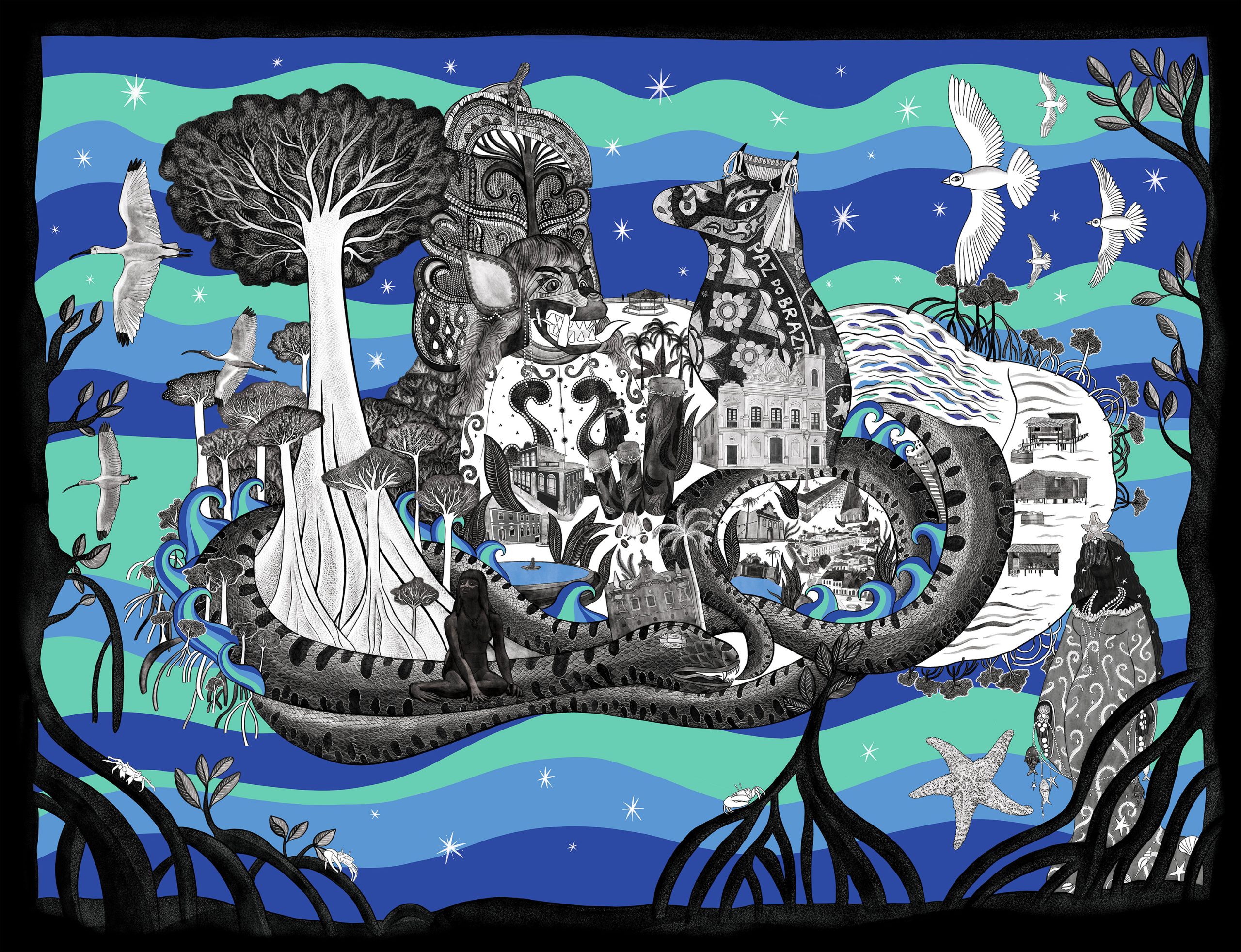 Villes Flottantes (Floating cities) is a monumental, immersive sound and augmented reality artwork co-created by visual artist Elsa Mroziewicz and author-sound designer Cécile Palusinski, with the support of musician Jean-Paul Le Goff. The project invites audiences to wander through imaginary floating cities inspired by real-world ecological solutions encountered during international residencies (Taiwan, India, Tunisia, Brazil, USA, France). It combines 2D animation, sound design, and AR technology, accessible via the “Under the Starry Vault” mobile app. Each city is accompanied by haikus, immersive audio logbooks, and animations highlighting innovative responses to climate challenges. This also provides access to videos A unique aspect is the embroidered version of the artwork (available from January 2026), created in collaboration with artisans from India and Brazil. These works on fabric honor ancestral techniques, offering a tactile counterpoint to digital art and restoring materiality and temporality to the experience. The installation also exists in leporello format, allowing portability and mediation in schools, festivals, and museums. It re-enchants our link with the ocean through poetic narratives, mythological references, and a commitment to spiritual and ecological transformation.
