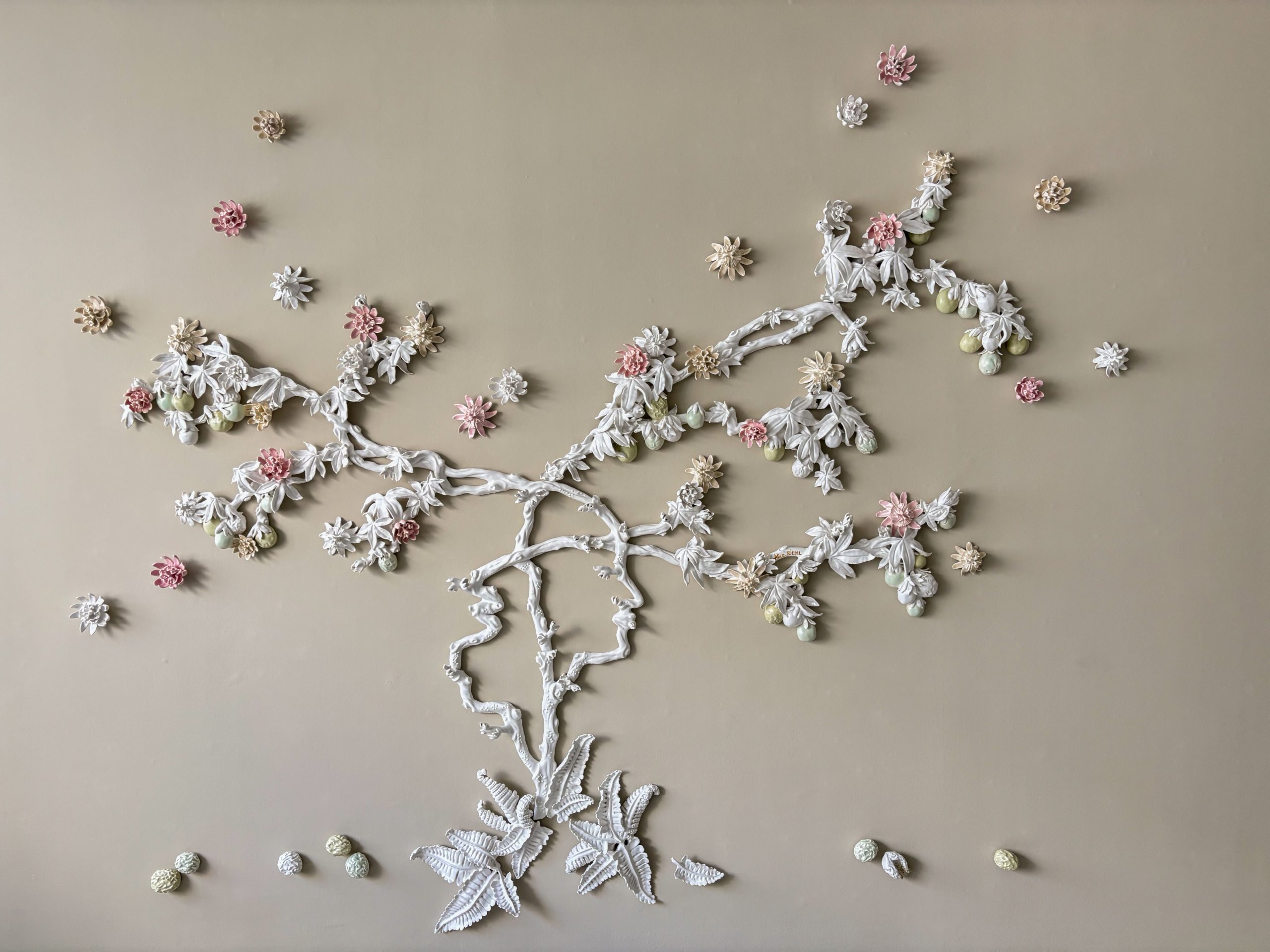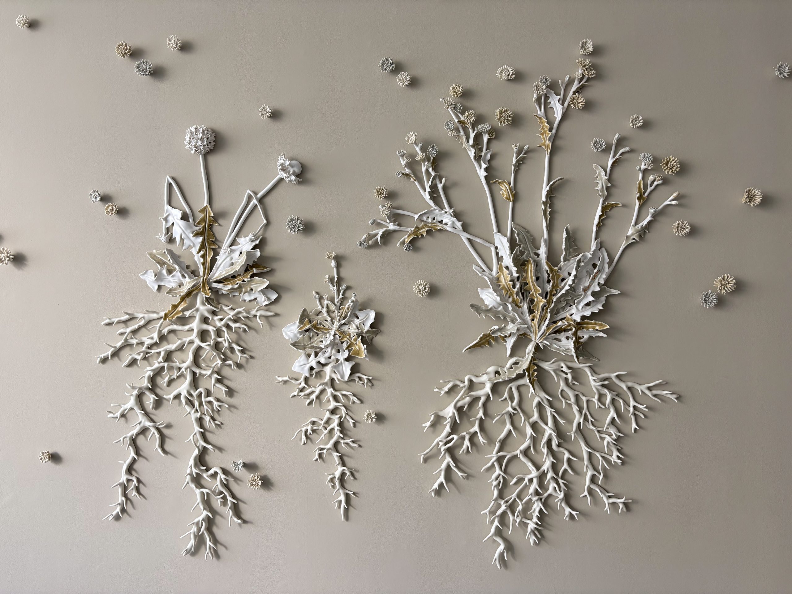 In my artistic practice, I design and craft large-scale porcelain wall installations. My approach to ceramics has always involved a form of hybridization between plant forms and textile works, echoing the happy moments of my childhood spent with my grandmothers amidst needlework and mountain walks. Initially inspired by lace and its floral patterns, which I imprinted into porcelain to create textured effects, I later became interested in tapestries, their plant motifs, narrative power, and symbolic register.